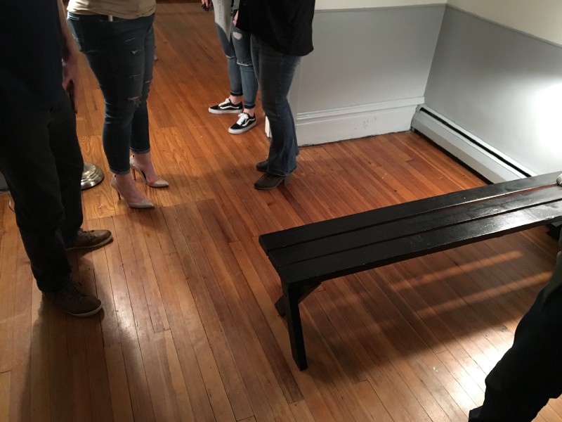 By 6:20 p.m., there are approximately 25 people shuffling through the house with the poise of MOMA and the polite, graciousness of an estate sale. The hardwood floors maintain a constant roar of conversation as the attendees — mostly friends and a few professors — make the most of what is likely the most interesting art event in the area. The conversation is punctuated by the stomping of running children — several of which belong to Metzbower — as they chase each other around the in-home gallery.