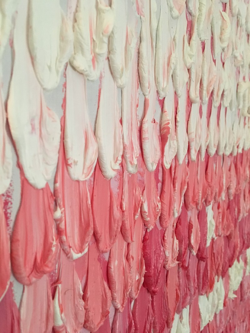 “A decade from now, you’re going to be able to take an Exacto knife and cut into some of these pieces, and there will be wet paint on the inside that has still not dried,” she says gesturing towards one of her denser creations.