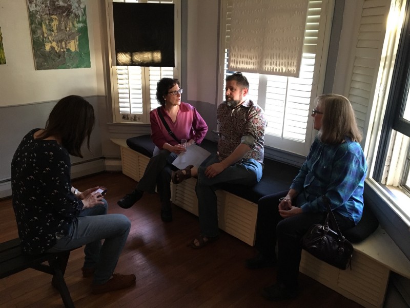Metzbower took a different — more audacious route — by converting the entire downstairs of her Chambersburg home into a multi-room art gallery. Here, she has meticulously placed the 30-plus paintings that make up “Audacity,” her MFA Thesis Exhibit. The public was invited in to see the results at a reception held on April 14, 2017.