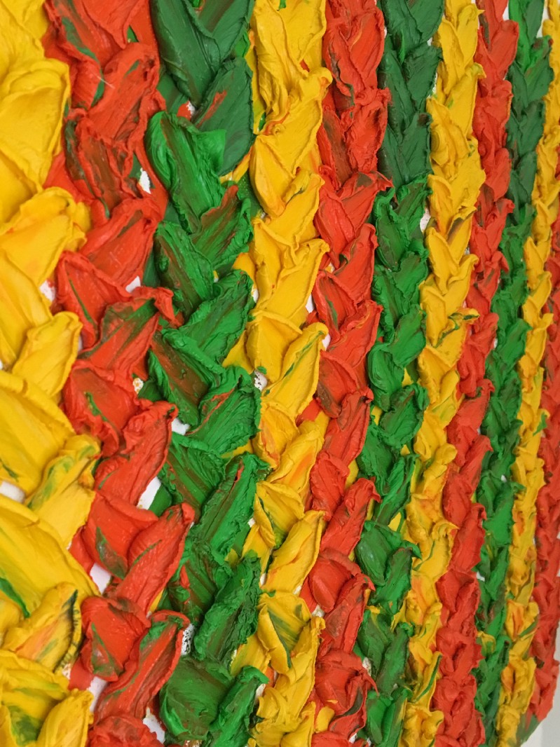 Metzbower creates sculptures out of paint. Sometimes as petal-like swirls that swell like multi-colored waves that are forever cresting but never breaking; other times as repeating patterns or lines that rise outward from the canvas into the room. Many painters study for years to create the impression of depth. Metzbower’s pieces have literal depth.