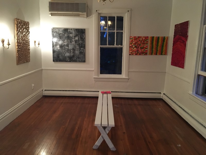 A table offers a price list, fluted champagne glasses and other refreshments. (It is my understanding that artists are responsible for providing the refreshments at their openings.) A staircase to the left leads up to what is now the “living quarters,” and a door to the right takes patrons to the first room of the gallery complete with original hardwood floors (circa 1913), extensive wall space and lots of natural light.