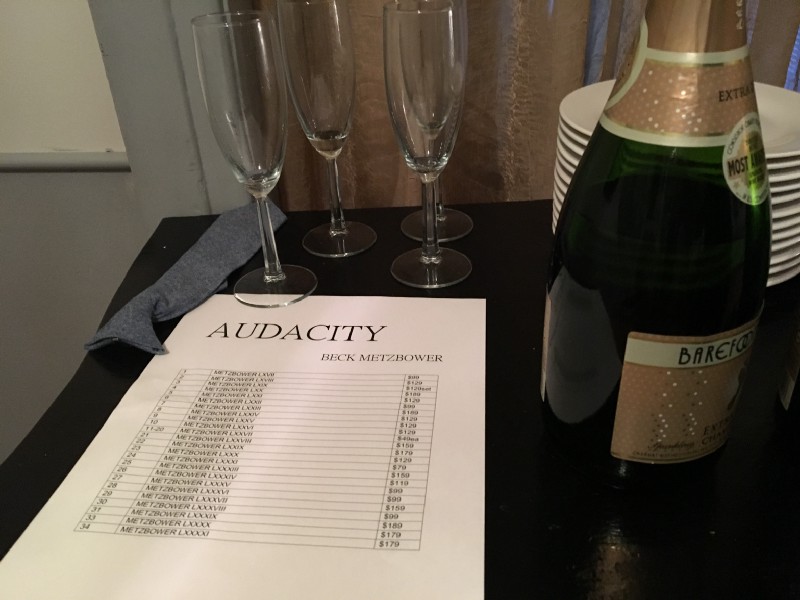 As the event extended into the evening and the natural light from the windows transitioned to the warm light of the sconces around the gallery space, the paintings changed accordingly. The paintings were now casting shadows onto themselves enhancing the dimensionality that makes Metzbower’s work stand out — both literally and figuratively. The challenge of hanging and lighting paintings like these made the physical space an integral part of the exhibit, and it made self-curation necessary.
