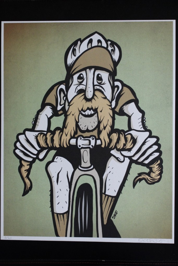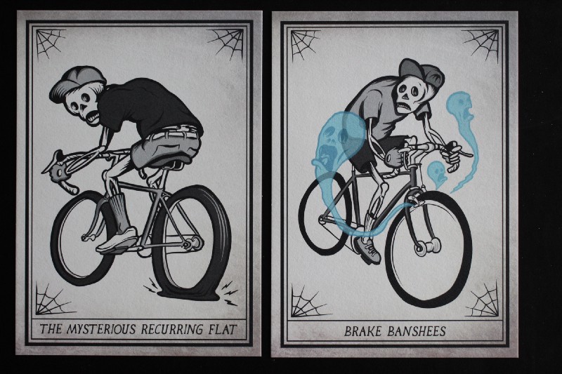The imagery in Fritz’s work includes facial hair of Nordic-proportions (one rider has a literal handlebar moustache; another rider reclines comfortably with his hands behind his head while his beard steers and holds a steaming cup of coffee) as well as a series of skeletal figures encountering situations that will cause cyclists of all skill levels to nod knowingly (“The Mysterious Recurring Flat” and “Brake Banshees”).