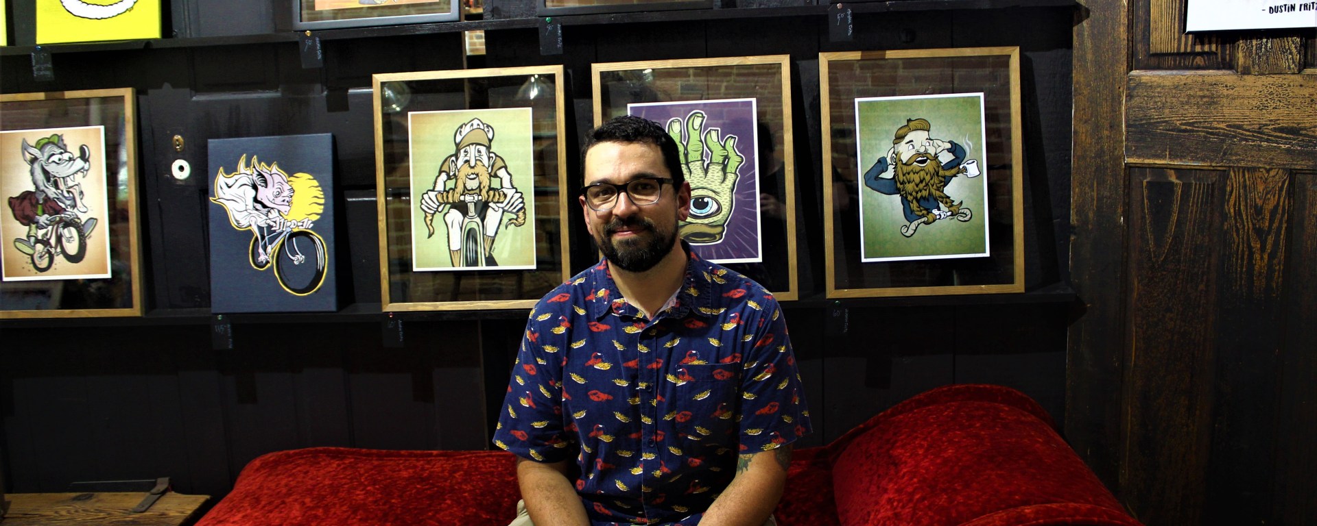 The design aesthetic falls somewhere between “traditional tattoo” and “Saturday morning cartoon,” which makes Fritz’s designs ideal for reproducing on hoodies and craft beer labels. (It doesn’t hurt that cycling apparel and independent brewing are large industries with lots of crossover appeal.)