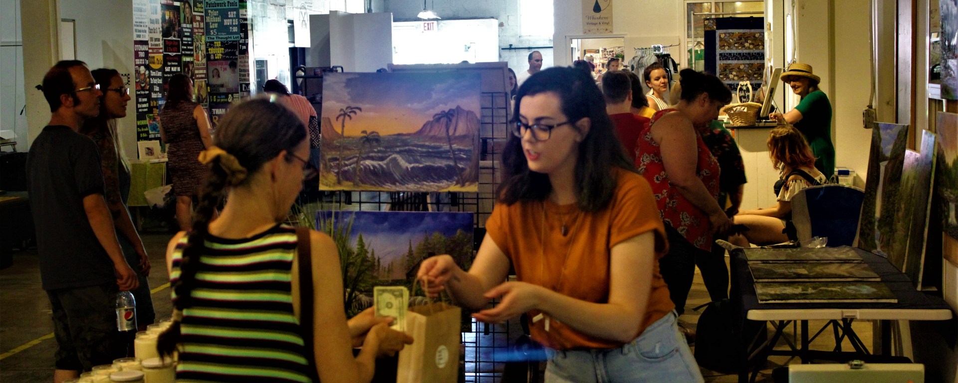 [Main image caption: Co-organizer Alexa Schoenberger of New Wave Candle Co. completes a sales transaction at “Creators & Makers” a summer pop-up handcrafted market held at The Thought Lot in Shippensburg on July 14.]