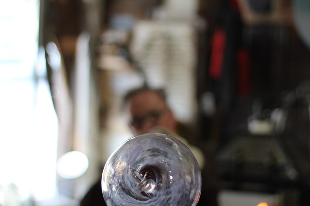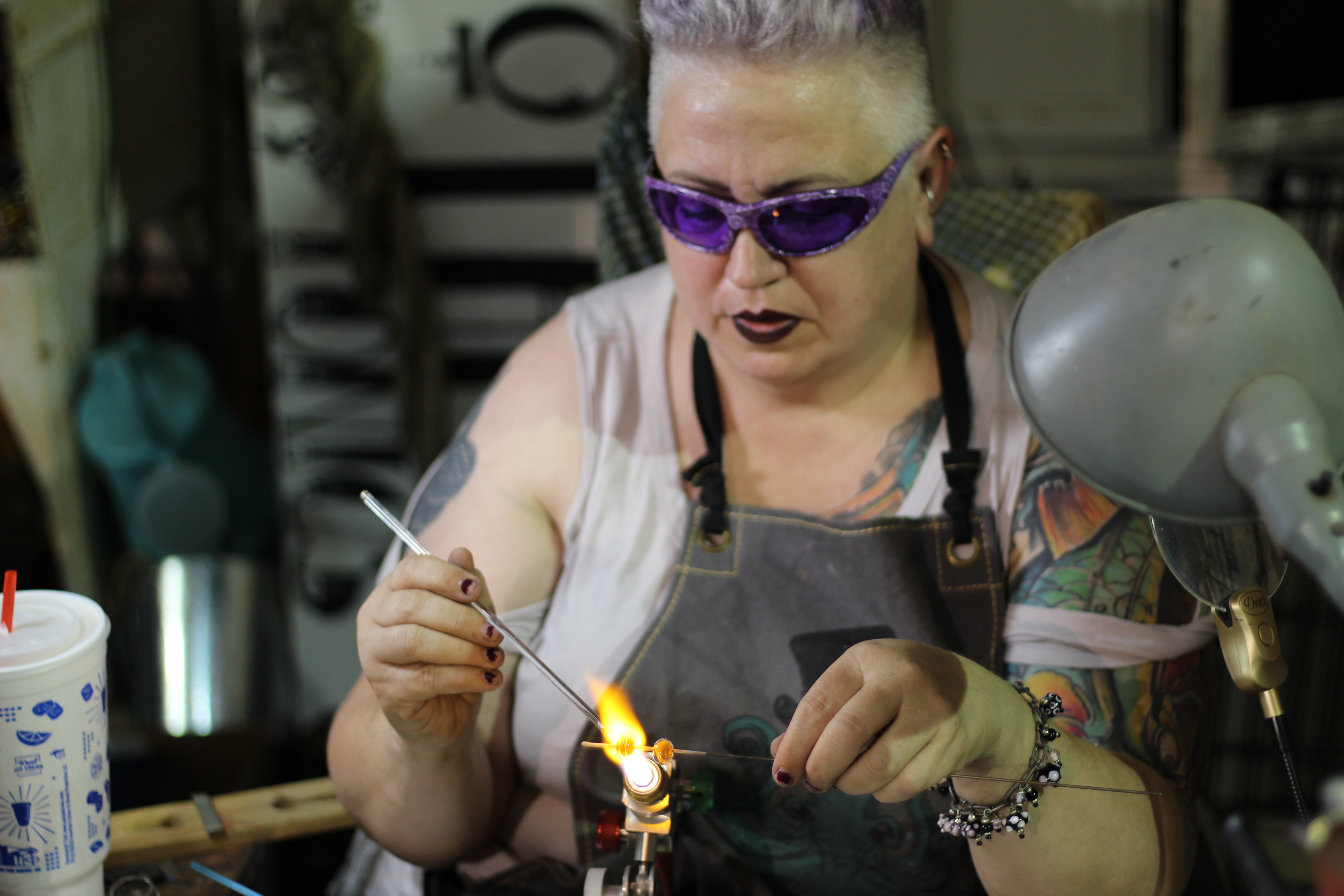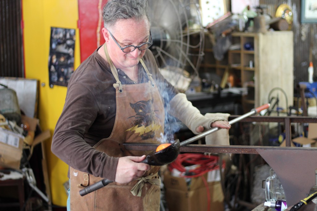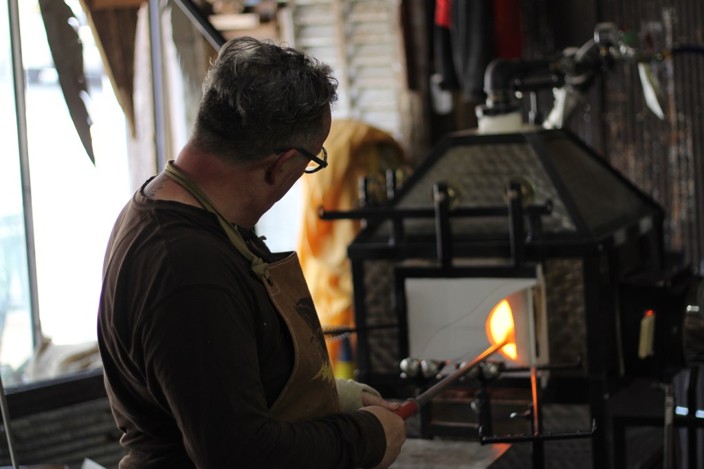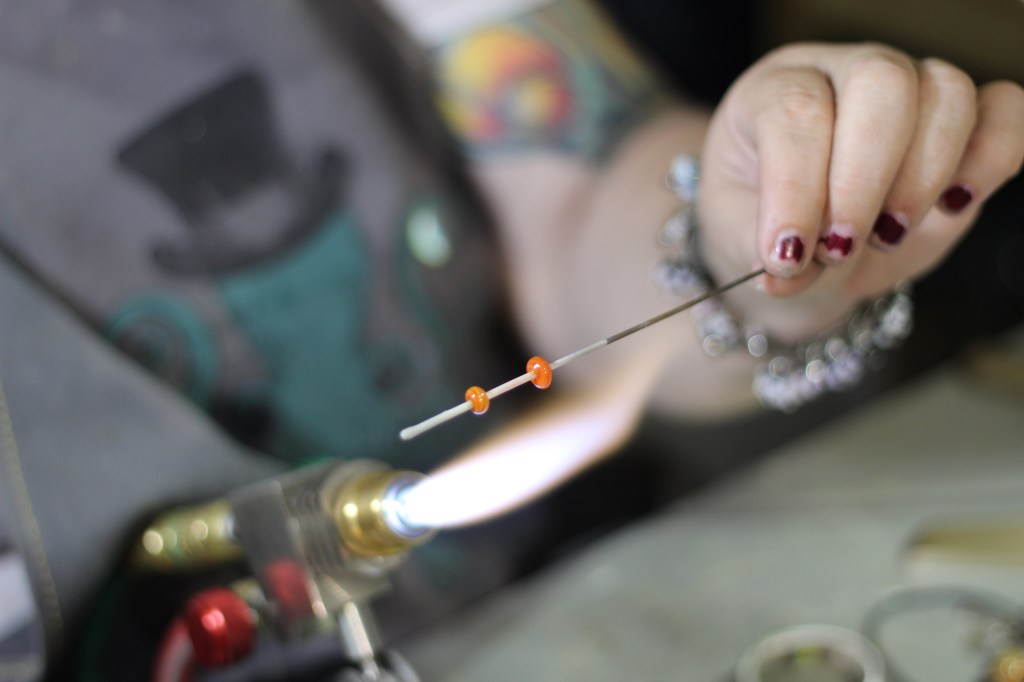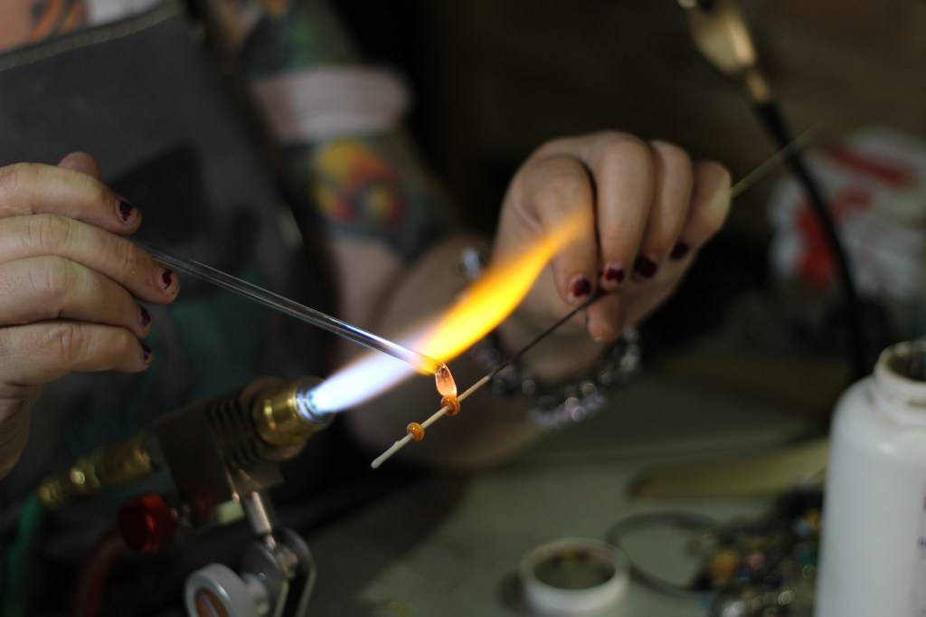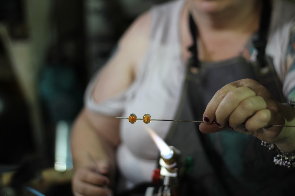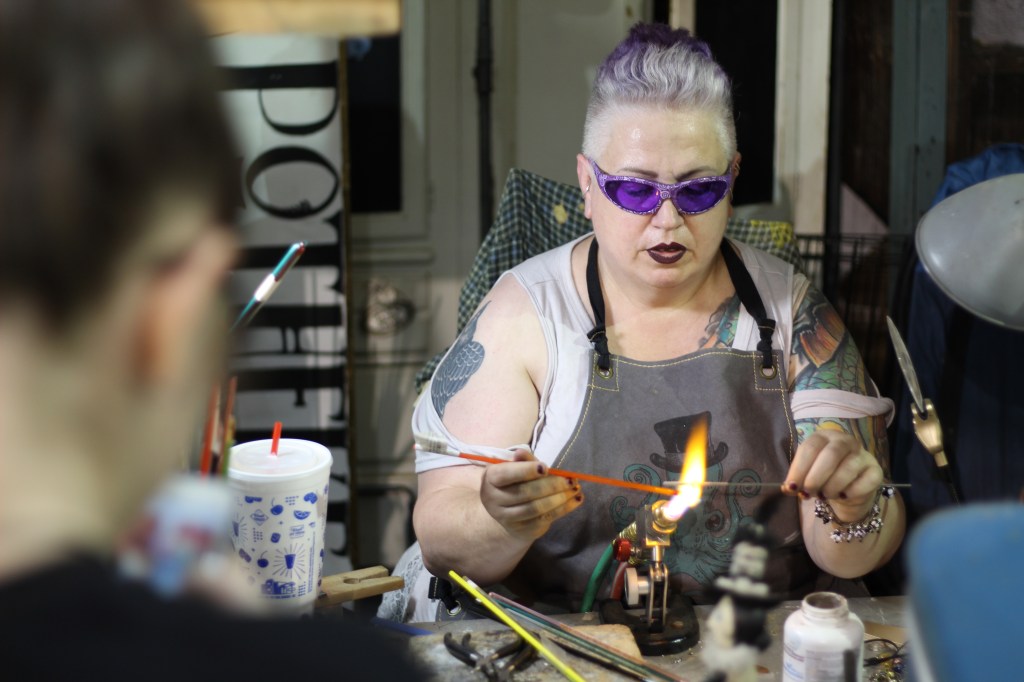 [Pictured: Tom Davis blows a glass ornament using a Double Baby Dragon Mobile Glassblowing Studio / Jen Davis uses a torch to create a pair of bead earrings while an audience watches.]