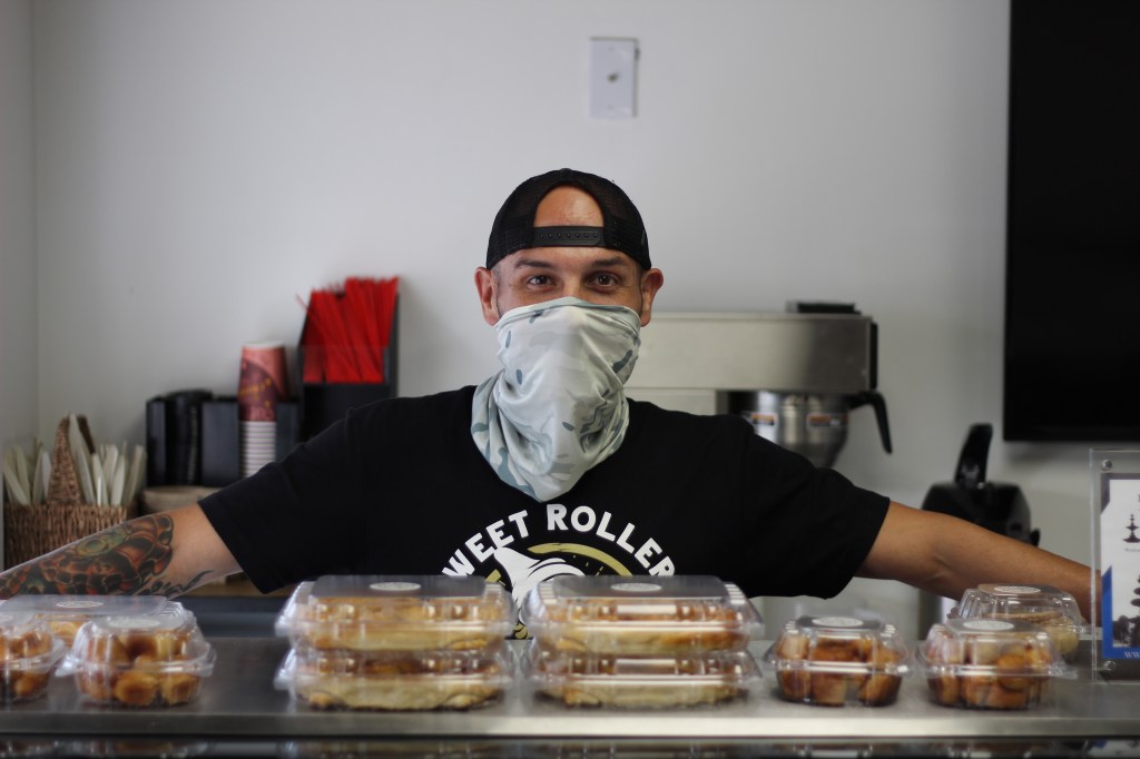 [Main image caption: Roque Zubia, founder of Sweet Rollers, poses in front of his location at 115 E. Queen St. on September 16, 2020. The logo on Zubia’s t-shirt, the storefront window and the cinnamon roll packaging was designed by Dustin Fritz.]