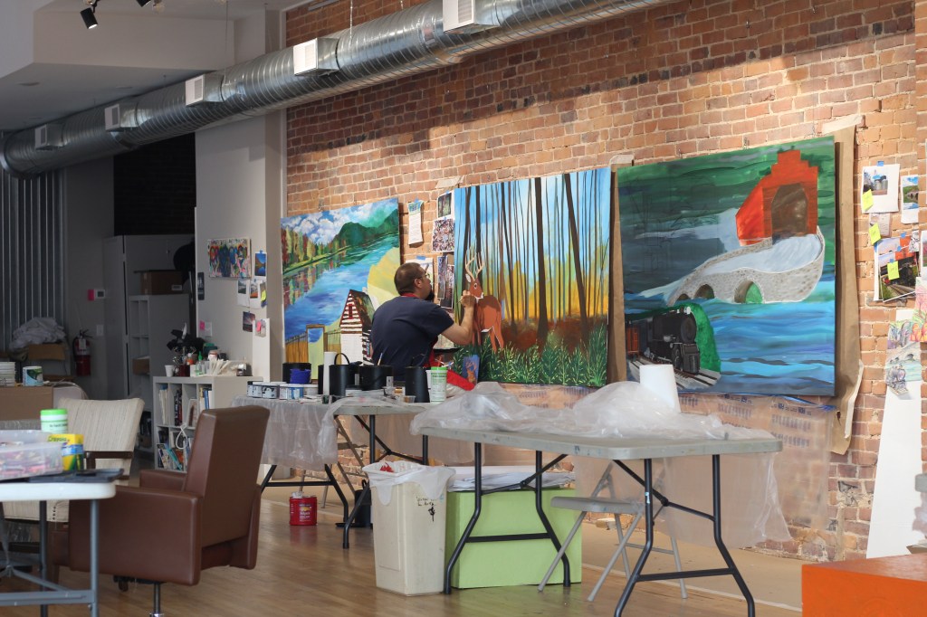 Five large panels hang in various states of done-ness, each surrounded by dozens of reference sketches and photographs that were submitted by the Franklin County Photography Club. A row of folding tables covered with painting supplies and what appears to be someone’s takeout run down the middle of the room forming the only barrier between the audience and the art. The yet-to-be-completed scenes feature forests, farms, a covered bridge and a creek.