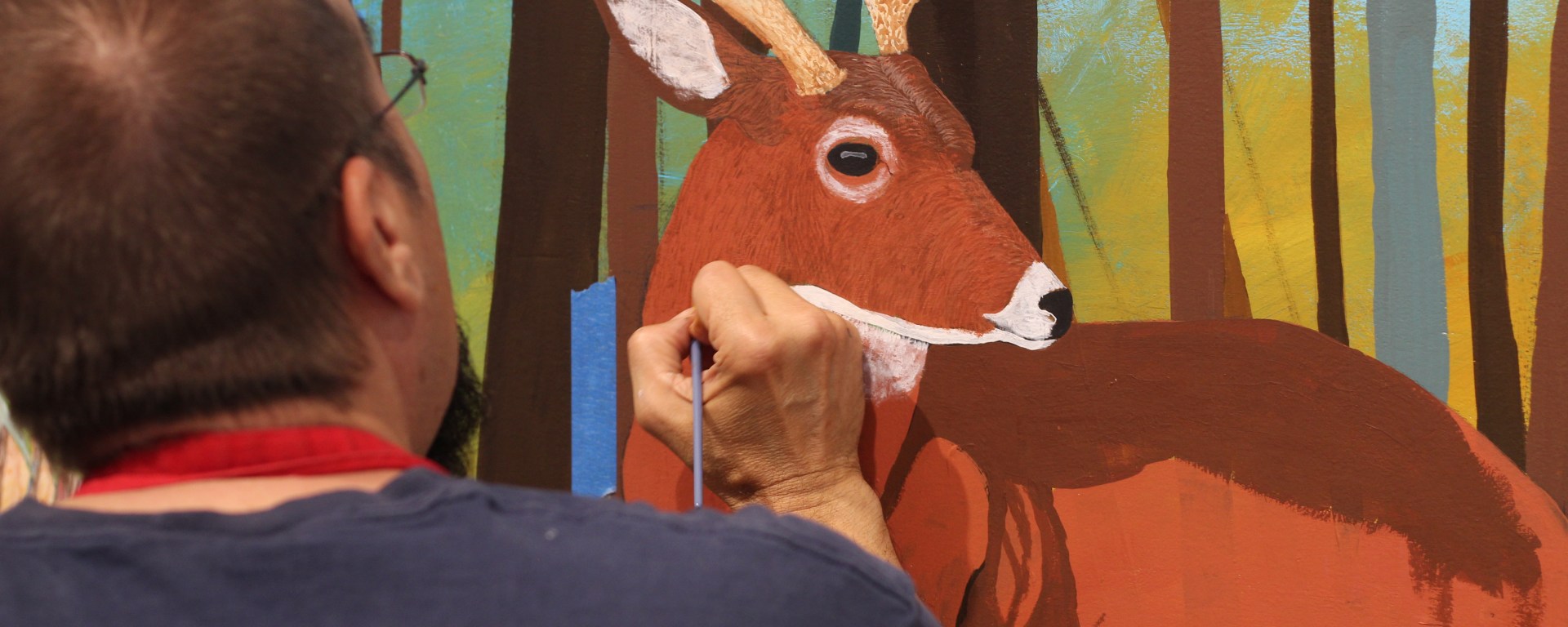 [Main image caption: Artist Mike Leighton adds a deer to part of the Council for the Arts’ courthouse mural project on Friday, June 3.]