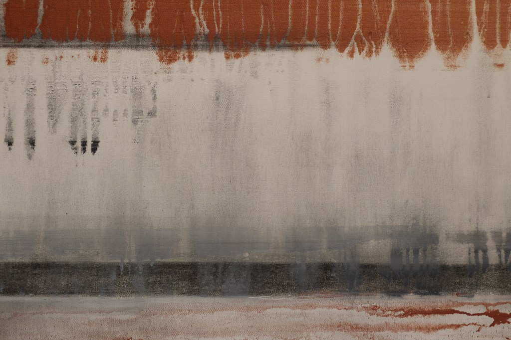 “The way that I work with acrylic is to water it down so there is a lot of speed, and the pace at which I have to respond to what is happening as things drip is a really nice kinetic challenge as well as a visual one,” said Legg referring to the technique employed in his paintings (titled “with this fire that my feet do walk” and “between the shroud and speaking in tongues,” respectively; together, they form a two-part series titled “Two Meditations after Golgatha”).