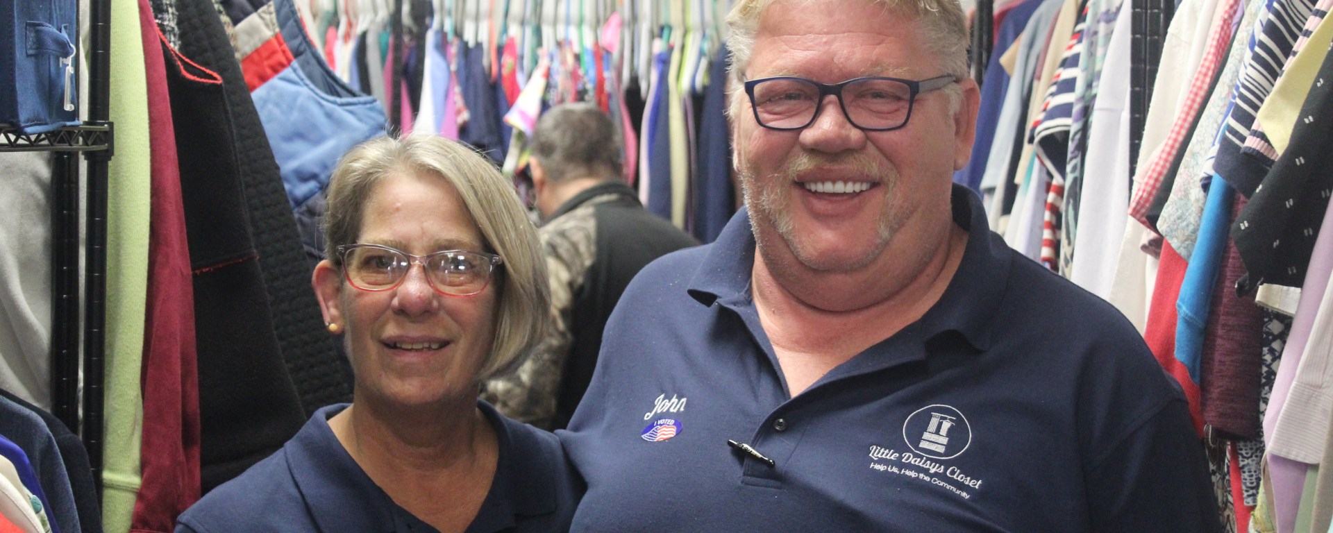 [Main image caption: Kathy and John McCrae pose inside Little Daisy’s Closet, a no-cost clothing ministry.]
