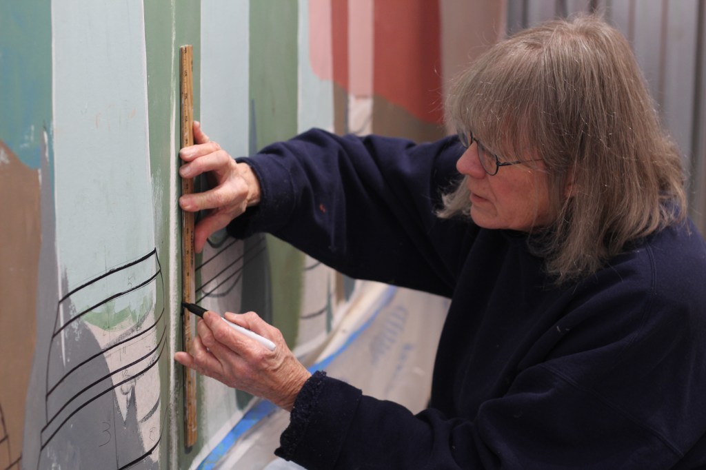 In the very back of the room, artist Linda Gottfried is figuring out how to recreate the mock-up’s watercolor effect using acrylic paints. She had initially resisted collaborating on the mural project saying “painting makes me nervous.” When Finch explained her paint-by-numbers approach, Gottfried decided to join up. “I just have to try to get the feeling of what she did,” said Gottfried, “and not have to reproduce it exactly.”